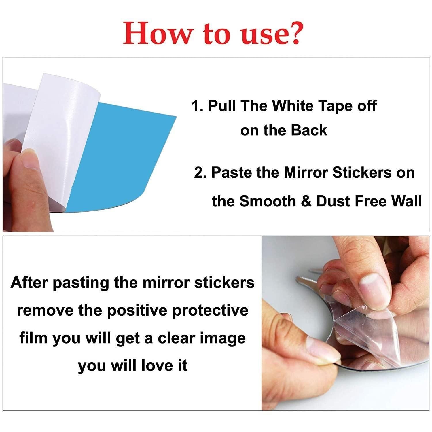 Q. How do I install the mirror stickers? Ans.Installation is easy and tool-free. Each sticker comes with a self-adhesive backing. Simply peel off the protective film and apply the sticker to a clean, dry surface following the included installation instructions.